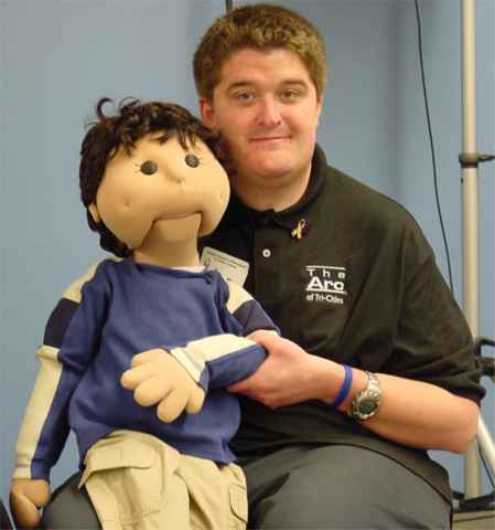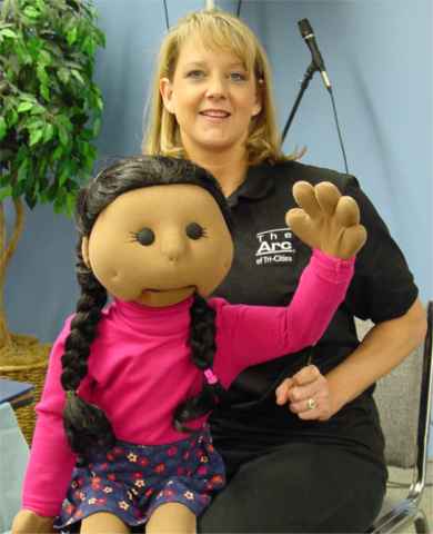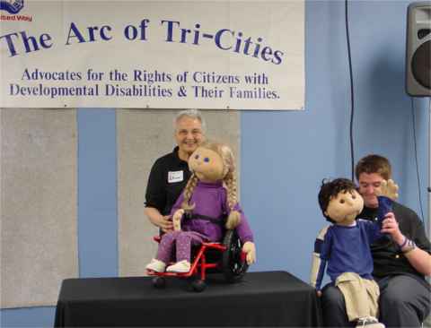 COUNT ME IN say the volunteers who bring puppets with hidden disabilities into classrooms and other public forums. The puppets greeted visitors to the Autism Awareness Fair. Naomi is a volunteer puppeteer for the ARC of Tri-Cities awareness program. |