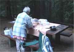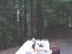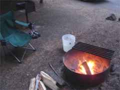 The kitchen and dining centered on the picnic table well anchored to asphalt. Fire was confined in a heavy steel circle. We used a $7 bundle each night. | ![]() |