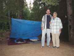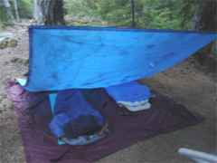 Tim's bag on the left and Naomi's on the right. We laid our sleeping bags on a ground cover. The tarp stretched nicely between two trees just the correct distance apart. |