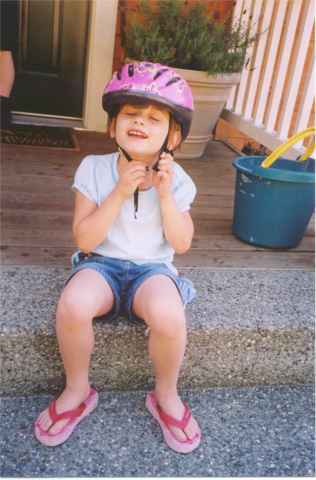 MORGAN WEARS A HELMET FOR TRICYCLE RIDING